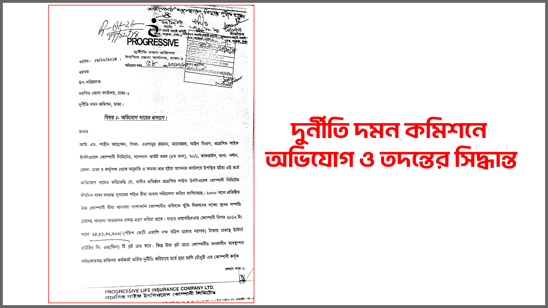 প্রগ্রেসিভ লাইফ দুর্নীতি দমন কমিশনে অভিযোগ করে ২০১৪ সালের ১৬ অক্টোবর। এই অভিযোগের ভিত্তিকে দুদকের অভিযোগ যাচাই-বাছাই কমিটি অনুসন্ধানের সিদ্ধান্ত গ্রহণের সিদ্ধান্ত গ্রহণ করে ২০১৪ সালে ৩০ অক্টোবর। দুদকের এই তদন্ত কমিটিতে ছিলেন- সহকারি পরিচালক মো. ফজজুল হক, সমন্বিত জেলা কার্যালয় ঢাকা-১, মানসী বিশ্বাস, উপ-সহকারি পরিচালক, দুদক, সমন্বিত জেলা কার্যালয় ঢাকা-১, মো. নুর আলম উপ-সহকারি পরিচালক দুদক, সমন্বিত জেলা কার্যালয় ঢাকা-১।