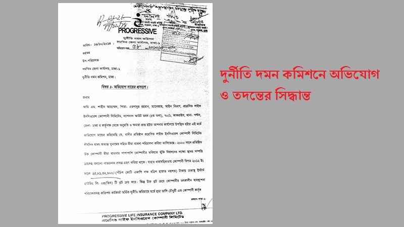 প্রগ্রেসিভ লাইফ ইন্স্যুরেন্স কোম্পানি লিমিটেডের পরিচালনা পর্ষদের সিদ্ধান্ত অনুসারেই দুর্নীতি দমন কমিশনে অভিযোগ করেন তৎকালীন ম্যানেজার (লিগ্যাল) এম শাহীন আহম্মেদ। এ অভিযোগ তিনি করেন কোম্পানির পরিচালনা পর্ষদ থেকে ক্ষমতা প্রাপ্ত হয়ে। শাহিন আহমেদের ক্ষমতা অর্পণ পত্রে স্বাক্ষর করেন তকালিন কোম্পানি সচিব এম নুরল আমিন।