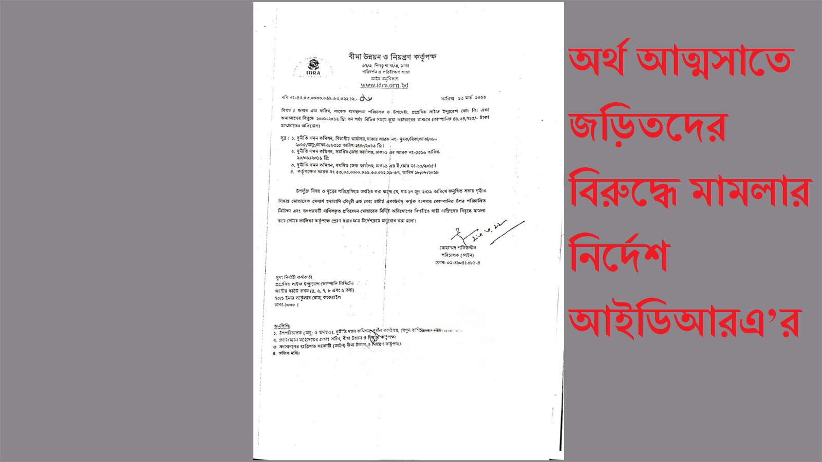 আত্মসাতে জড়িতদেরকেই মামলা করার নির্দেশ দিল আইডিআরএ