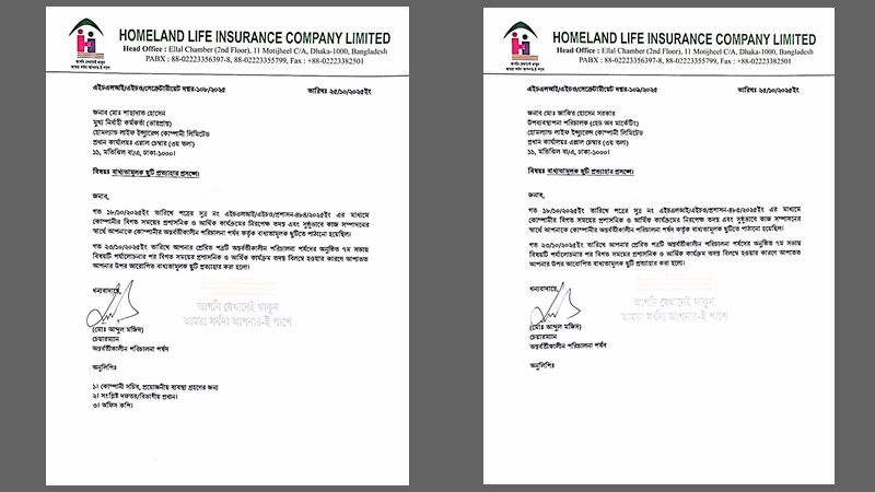 হোমল্যান্ড লাইফ ইন্স্যুরেন্সের এই দুই কর্মকর্তার বিরুদ্ধে কোম্পানিটির বিগত সময়ের প্রশাসনিক ও আর্থিক অনিয়ম তদন্তের উদ্যোগ নিয়েছে উচ্চ আদালতের গঠন করে দেয়া প্রতিষ্ঠানটির অন্তর্বর্তীকালীন বোর্ড। এই তদন্ত কার্যক্রম নিরপেক্ষ এবং সুষ্ঠুভাবে সম্পাদনের স্বার্থে গত ১৮ অক্টোবর তাদের বাধ্যতামূলক ছুটিতে পাঠানো হয়।