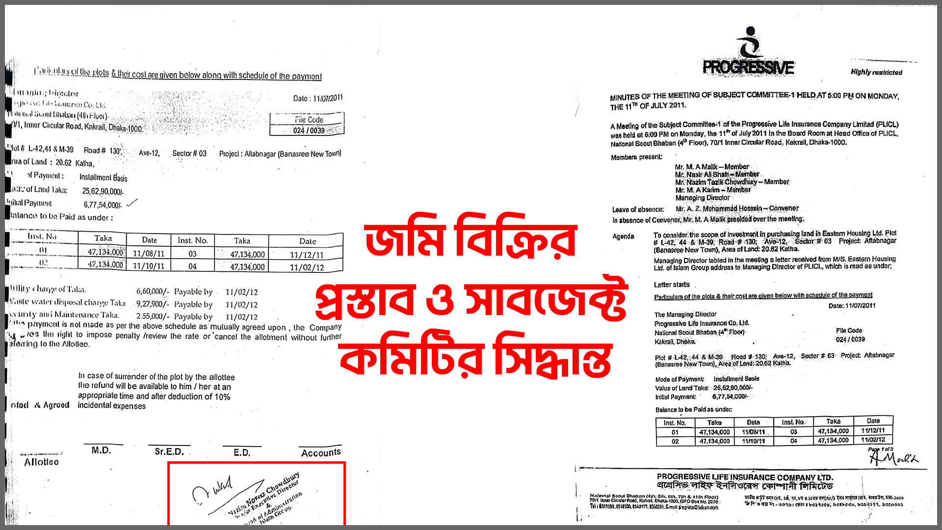 ইস্টার্ণ হাউজিং প্রগ্রেসিভ লাইফের কাছে জমি বিক্রির প্রস্তাব করেন ২০১১ সালের ১১ জুলাই। ইস্টার্ণ হাইজিংয়ের পক্ষে এই প্রস্তাব করেন নাজিম নওয়াজ চৌধুরী। ওই দিনই প্রগ্রেসিভ লাইফের সাবজেক্ট কমিটি-১ জমি ক্রয়ের সিদ্ধান্ত নেন। সাবজেক্ট কমিটির ওই সভায় ছিলেন জমি বিক্রির প্রস্তাবকারির ছোট ভাই নাজিম তাজিক চৌধুরী ও তার দুলাভাই নাসির আলি শাহ। এছাড়া পরিচালক এম এ মলিক ওরফে আব্দুল মালিক এবং কোম্পানির ব্যবস্থাপনা পরিচালক এম, এ করিম।