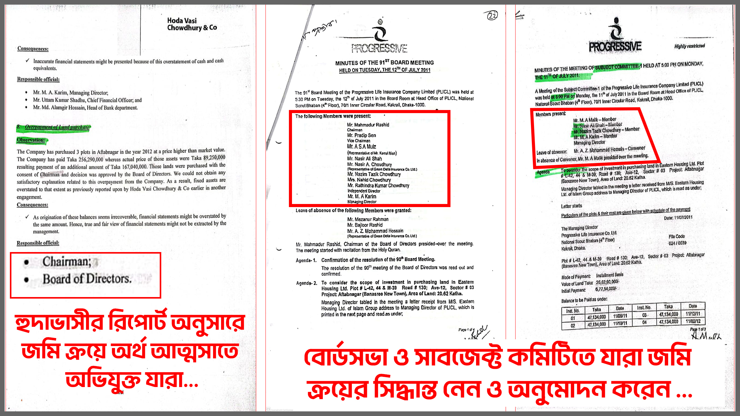 ২০১১ সালে ১১ জুলাই অনুষ্ঠিত সাবজেক্ট কমিটি-১ জমি কেনার সিদ্ধান্ত নেয়া হয়। এর পরের দিনই ১২ জুলাই অনুষ্ঠিত ৯১ তম বোর্ড সভায় সাবজেক্ট কমিটির সিদ্ধান্ত অনুমোদন করা হয়। ওই পরিচালক মহমুদর রশিদের সভাপতিত্বে অনুষ্ঠিত ওই সভায় ছিলেন- পরিচালনা পর্ষদের ভাইস চেয়ারম্যান প্রদীপ সেন, পরিচালক কামাল মিয়া, প্রতিনিধি হিসেবে উপস্থিত ছিলেন এ এস এ মুয়ীজ, নাসির আলি শাহ, গ্রীন ডেল্টা ইন্স্যুরেন্সের প্রতিনিধি হিসেবে উপস্থিত ছিলেন কোম্পানির তৎকালীন ব্যবস্থাপনা পরিচালক নাসির এ চৌধুরী। নাজিম তাজিক চৌধুরী, নাহিদ চৌধুরী, নিরপেক্ষ পরিচালক হিসেবে উপস্থিত ছিলেন রথিন্দ্র কুমার চৌধুরী ও কোম্পানির তৎকালিন মুখ্য নির্বাহী এম এ করিম।